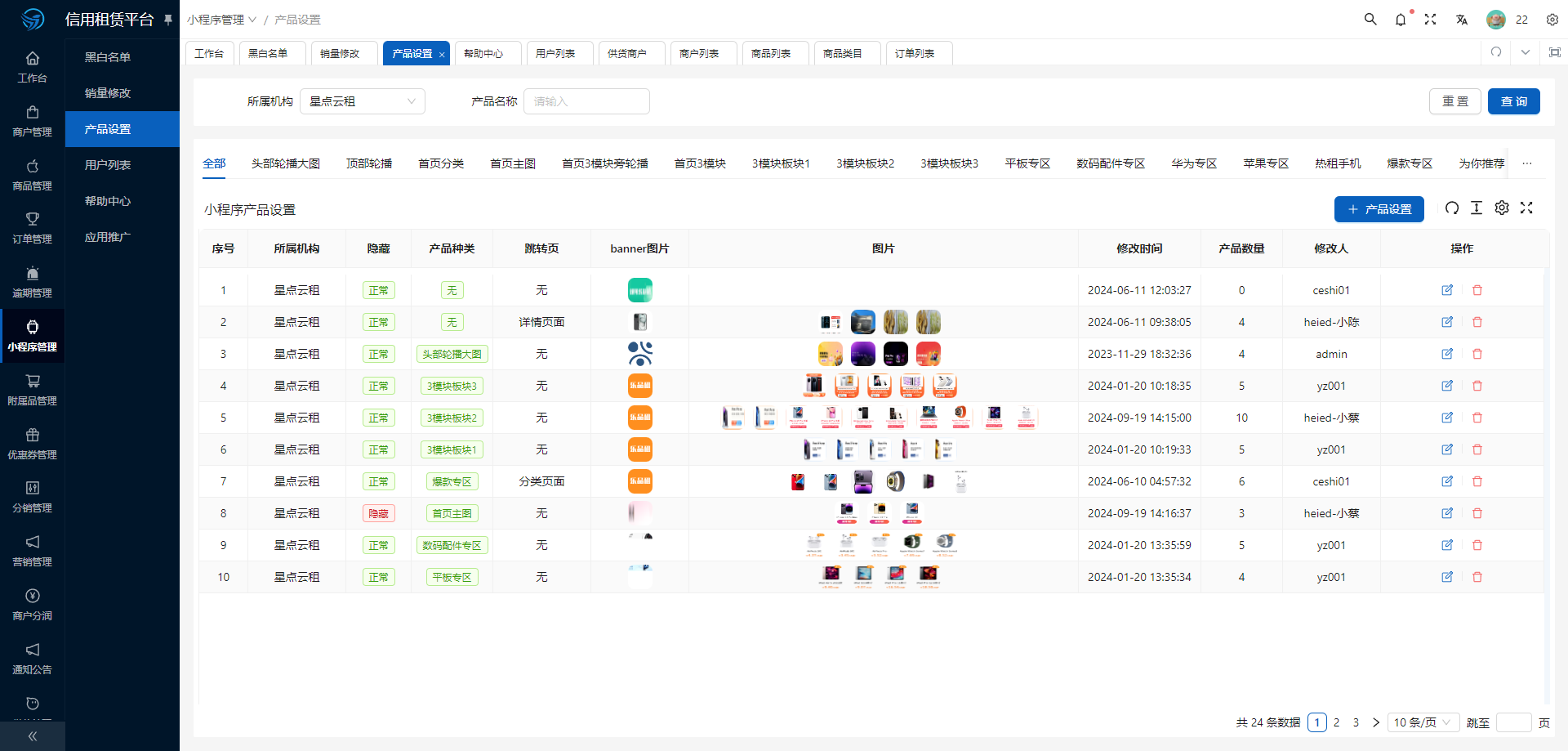 # 修改前端布局 该功能是对前端页面进行DIY设计   banner图:只有部分模块需要,如苹果专区、华为专区等 隐藏:点击是会隐藏模块,前端不在显示 产品种类:选择模块类型 跳转页面:选择跳转页面,如商品详情页,分类页等 所属机构:想要修改的小程序平台机构 加一行按钮:会在下方列表添加一行没有商品信息的栏目,点击它的修改按钮可以修改跳转页面,图片等信息  选择产品:点击后会出现产品列表,勾选产品点击确会添加一条带有产品信息的栏目,点击修改选择跳转页面为详情页面后,这张图片就会跳转到商品详情页