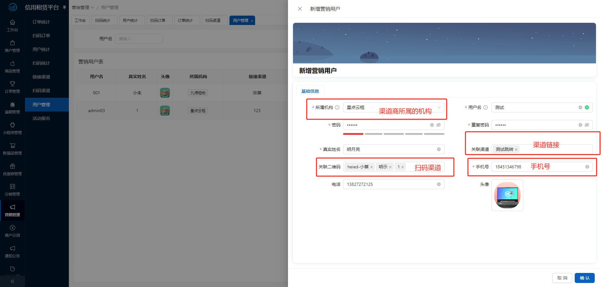 # 页面展示 该用户是用于渠道商登录系统使用的账号  # 新增用户 填写对应信息点击确定并保存