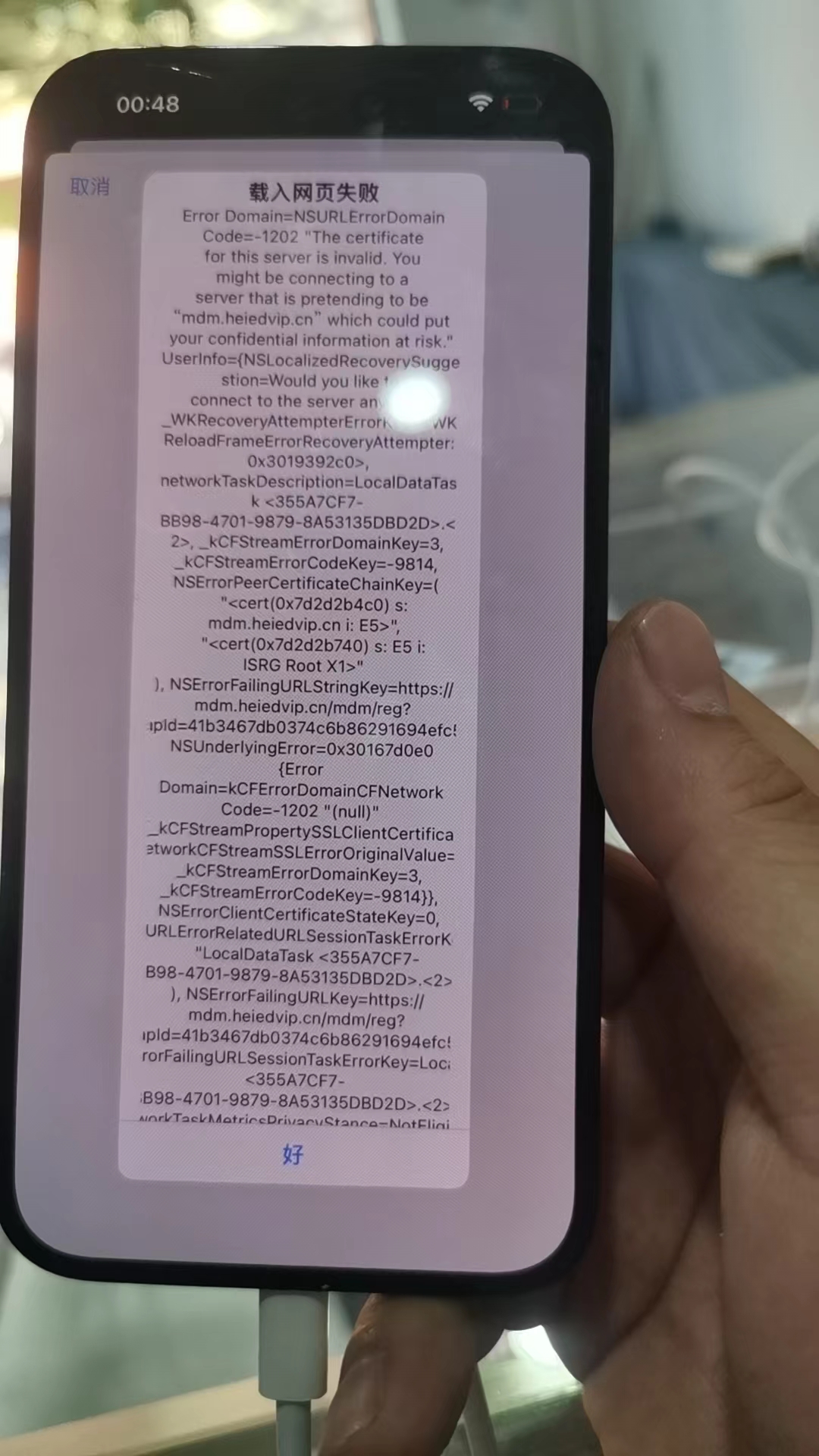 # 1、IOS18系统上锁无网(此问题已解决) 关于苹果手机IOS18系统上锁后网络无法连接的问题解决 PS: VPN长期打开有托管风险,使用后请关闭,打开与关闭时设备不要锁屏 PS: 此方案不完善,尽量不要升级18系统 1、MDM后台-设备列表-设备详情-功能限制策略-关闭禁止创建VPN连接限制一点击应用策略 2、用户设备一通用一还原一还原网络设置 3、确认设备网络恢复使用后一打开禁止创建VPN连接权限-点击应用策略   # 2、扫描图形码后提示未能完成操作或未跳出远程管理 1、进入MDM监管所后台点击证书管理 - ADM证书查看证书是否失效,若证书失效请按照下方的步骤进行修改,若证书未失效请联系我司 2、平台需登录苹果商务管理后台,登陆成功后点击左下角个人信息会出现小弹窗点击偏好设置,进入新页面后子二级导航中找到你的MDM服务器点击本司MDM服务器名称,在详情页面上面找到下载MDM服务器令牌进行证书下载,下载完成后可转发给我司进行配置,也可本司自行配置       # 3、登录MDM监管所后台弹窗提示 平台登录MDM监管所后台输入账号密码出现下方截图提示,说明本系统日志满了需要清理日志,清理日志需要登录平台服务器进行清理,平台可自己操作(我司会提供技术支持)也在由我司进行处理  # 4、上锁时扫描图形码扫描不上 商家在上锁过程中遇到下方视频中使用手机app进行扫码,在扫码时扫描图形扫描不上 1、把上锁手机里面的手机信息抹除 ,在重新上锁 2、卸载手机app重新下载,下载完成后在重新上锁 [44d3ec00766bf0e94b1b96edfd405dc2.mp4](https://zhishi.heiedvip.cn/uploads/20241012/1c1e4fe02a2b3481f200d2e25e738605.mp4) # 5、添加iPhone失败 在上锁时扫描图形码后提示添加iPhone失败 ## 1.Desc: 已取消 1、排查网络,查看手机网络是否流畅或查看手机是否有连接网络 2、手机问题  ## 2.Desc:暂时注册失败 若出现暂时注册失败文字提示,说明此设备已经绑定了其他ABM(苹果商务管理)需要平台先登录已绑定过的ABM账号找到此设备对其进行解绑或换成绑定的ABM账号在进行上锁才能成功  ## 3.Desc:广播原语已失效 若出现广播原语已失效文字提示,说明此商户mdm证书已过期,需登录abm后台下载p7文件证书更行到mdm后台中,更新完成后在重新上锁即可  # 6、远程管理出现载入网页失或无法从“*****公司”下载iPhone的配置(null) 二次抹除后连接wifi在远程管理中监管机提示载入网页失败或无法冲“*****公司”下载iPhone的配置(null),则说明所配置的ssl证书出现问题,若出现这两种情况及时联系我司,由我司进行处理   # 7.监管机过多,abm未解绑注册资金不够设备的价格,苹果可能封abm账号 建议所有都解绑,解绑以后那个激活锁不要关,关闭以后就开启不了了,不用注册新的,解绑不会影响控制手机 需要注意的是手机没有完全交付之前,不要去关闭激活锁,解绑abm以后激活锁就再开启不了了,没有激活锁 手机刷机了就和正常的手机一模一样了,一天不能解绑得太多了容易风控,风控后需要等待几天可以继续解绑 # 8.configurator无法发送验证码 把当前上锁的设备个人 id 退掉,登录上锁的 abm 账号。这样就可以接收验证码,并且登录configurator 也不需要收验证码 、 # 9.后台显示等待执行,但客户手机已经锁掉了 若出现上述情况是客户原因,现在市场上面有很多屏蔽监管锁的,客户可能会在某软件上进行购买,购买成功后并进行执行就会屏蔽监管锁,屏蔽后就锁不了机器了但是有些没屏蔽好就会偶尔被锁 # 10.手机上锁后手机app无法使用 监管机上锁成功后并未对其进行上锁,用户使用手机app时弹出弹窗提示无法使用或被限制,需现在登录后台取消禁用退出远程管理限制取消完成后还需登录苹果商务后台根据序列号找到此手机并对其进行解绑 `注:苹果商务后台手机解绑不会对手机有任何影响`  |  |  |  | | ---------------------------------------------------------------------------------------------- | -------------------------------------------------------------------------------------------- | -------------------------------------------------------------------------------------------- | | | | | # 11.无法激活 扫描图形码后提示无法激活此iPhone,说明此设备网络有问题,重新检查网络在对其进行上锁  # 12.设备连接网络后后台最后通讯时间未更新 1.此设备极大可能把监管锁进行屏蔽了 2.所连接的网络有问题,检查网络重新连接或连接新网络
