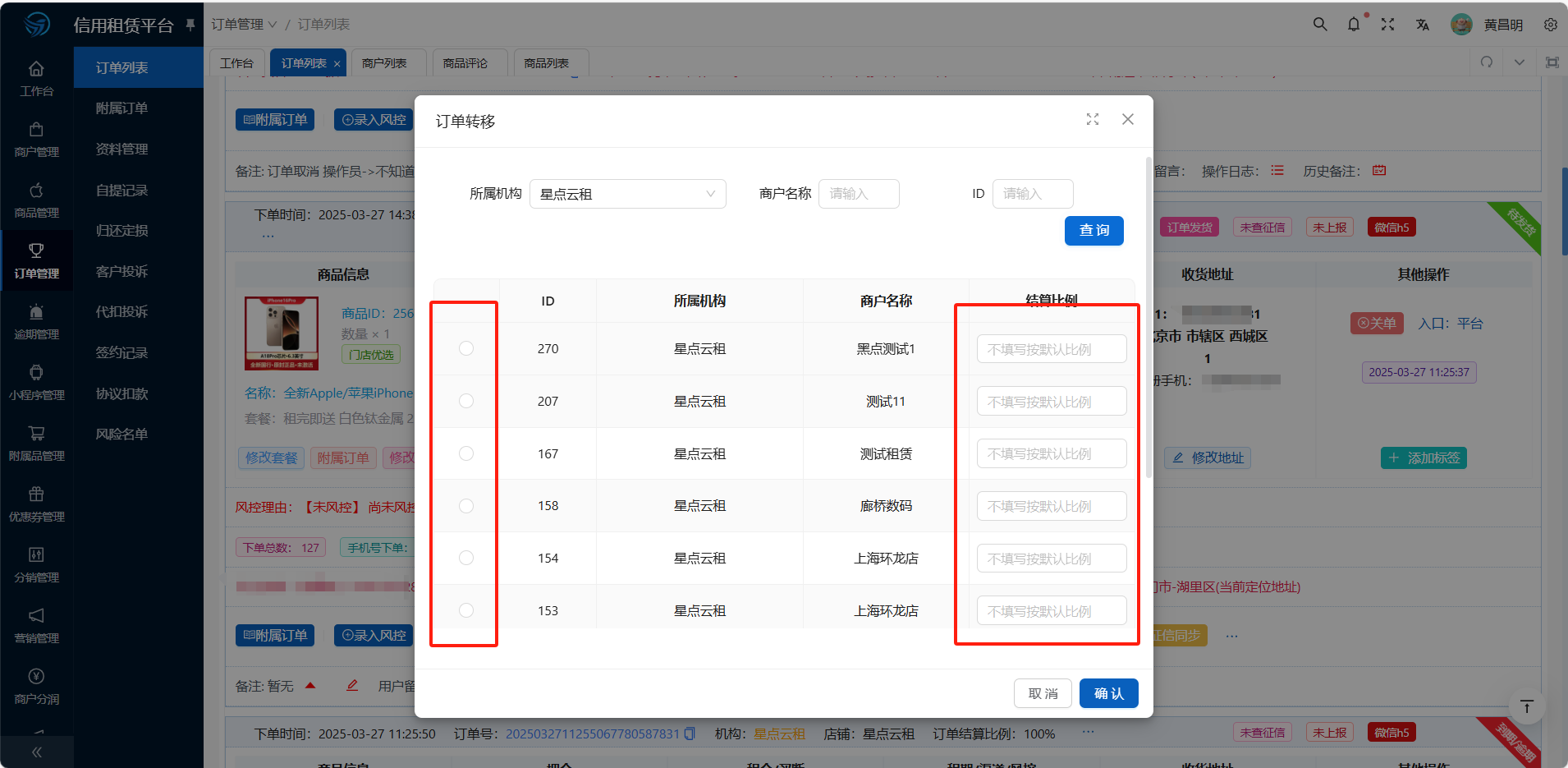 # 平台商家入驻经营规则 # 商户入驻 商户入驻平台中需要商户提供营业执照以及法人身份证正反面,商户资料提供后平台需要在商户管理 - 商户列表中填写商户信息,在填写是平台要注意基础信息中的体现比例,提现比例为抽取商户的入驻费(亦为抽点)提现比例填写方式为一百减去抽点点数相减后的数额填写在提现比例中,在参数配置中下方的扣费配置为平台收取商户的接口费,平台需结合自己的运营规则进行修改,是否启用为否商户不需要支付接口费所有接口费由平台进行支付,是否启用为是则商户需要支付接口,默认价格为官方正常收取的费用,若平台丢对价格进行修改商户接口费按照修改的后的价格进行支付 `在注册或者配置过程中,提示公司名称错误,文字名称没错的情况下,一般是括号问题,中文括号或者英文括号,以后切换试试。`   # 商户资金 商户要查看自己的资金的情况需点击商户列表 - 操作下方的租金提现按钮,点击后页面中会显示商户自己的资金数据,注全平台的资金统一进入到平台的公户中,商户需申请提现,申请后平台要在财务管理中进行提现审核,审核完成后需线下对商户进行打款 租金账户 租金余额:商户可提现金额 未结算金额:用户已支付租金,订单未发货,发货后自动结算 次日结算金额:次日自动结算金额次日自动结算 已结算金额:用户支付租金后根据订单结算比例(设置的提现比例)计算出的租金基恩 计算逻辑:用户支付租金,先根据订单的结算比例先进行第一次结算,结算后的金额会显示在已结算金额中,系统在根据商户所使用的接口费在进行一次计算(已结算金额 - 风控账号中的负值),最终将计算完成的金额显示在租金余额中   # 商户订单比例结算 ## 前置抽佣 前置抽佣为添加商户时参数配置中流量计费,可理解为除接口费以外其余服务抽佣,填写方式为直接填写抽佣比例,计算方式为完结价(总租金+买断尾款)乘以计费比例并自动从该商户租金余额中扣除  ## 账单抽佣 在添加商户时所填写的提现比例,若没有使用第二种方式进行计算,那么商户中的提现比例为默认订单抽佣比例  ## 商品抽佣 在上传商品是基础信息中的提现比例,若平台或商家在此提现比例中填写比例值,那么本商品的订单的结算比例会按照商品中所填写的提现比例进行计算,商户中所填写的提现比例会被覆盖,也就是商品中的提现比例优先级比商户中的优先级要高  ## 订单转移抽佣 平台运营规则为商户自己做的订单抽佣比例为一个值,平台分配给商户的订单抽佣比例为另一个值,那么平台需要先在商户中填写商户自己做的订单抽佣比例,平台分配给商户的订单抽佣需要通过订单列表中的订单转移实现,平台点击订单转移后会出现一个弹窗,平台需在弹窗中选项商户并设置新的抽佣比例   ## 附属订单抽佣 商户在做单时订单中会有附属订单生成,附属订单为除总租金外其他增值服务所要收取的费用,商户添加完成后平台可自行定义是否需要对本商户订单中的附属订单进行抽佣,若需要平台需在附属品管理 - 结算比例中填写抽佣比例(若出现商户无法查看自己的附属订单也要在附属品管理中填写比例),若不需要抽佣无需任何操作商户自主经营即可   ## 线下抽佣 商户在做单过程中,有些用户会选择线下支付给商户,那么商户在后台操作账单标记已线下交易时平台针对商户进行的抽佣系统也是会进行结算的,结算数据在财务管理 - 线下付款中进行数据查看,那么在商户列表中的租金余额也会相对应的减除,已结算明细中也会有相对应的结算数据